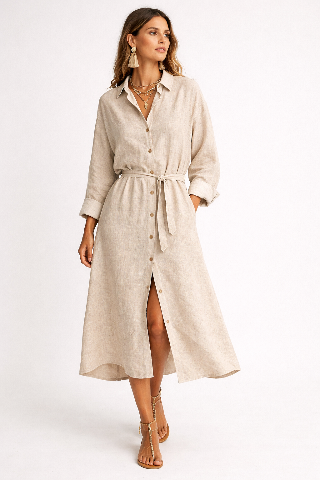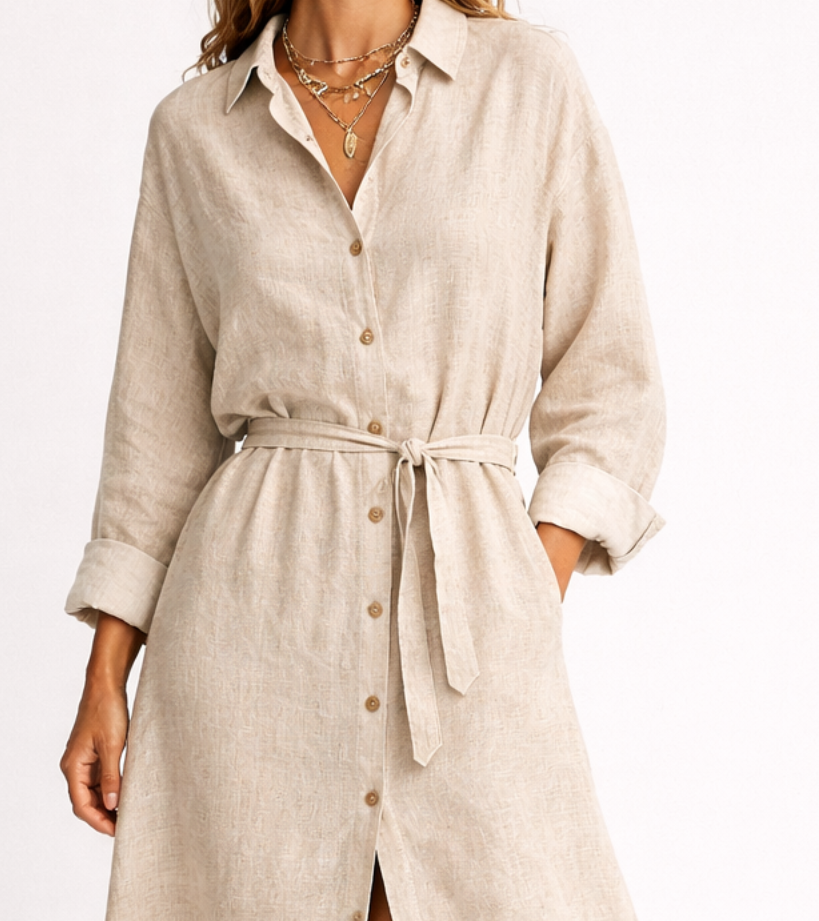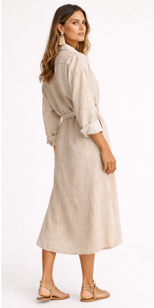 keten elbise, gömlek elbise, bej elbise, yazlık elbise, kuşaklı elbise, doğal kumaş elbise, pamuk keten elbise, midi elbise, rahat kesim elbise, resort wear, tatil elbises